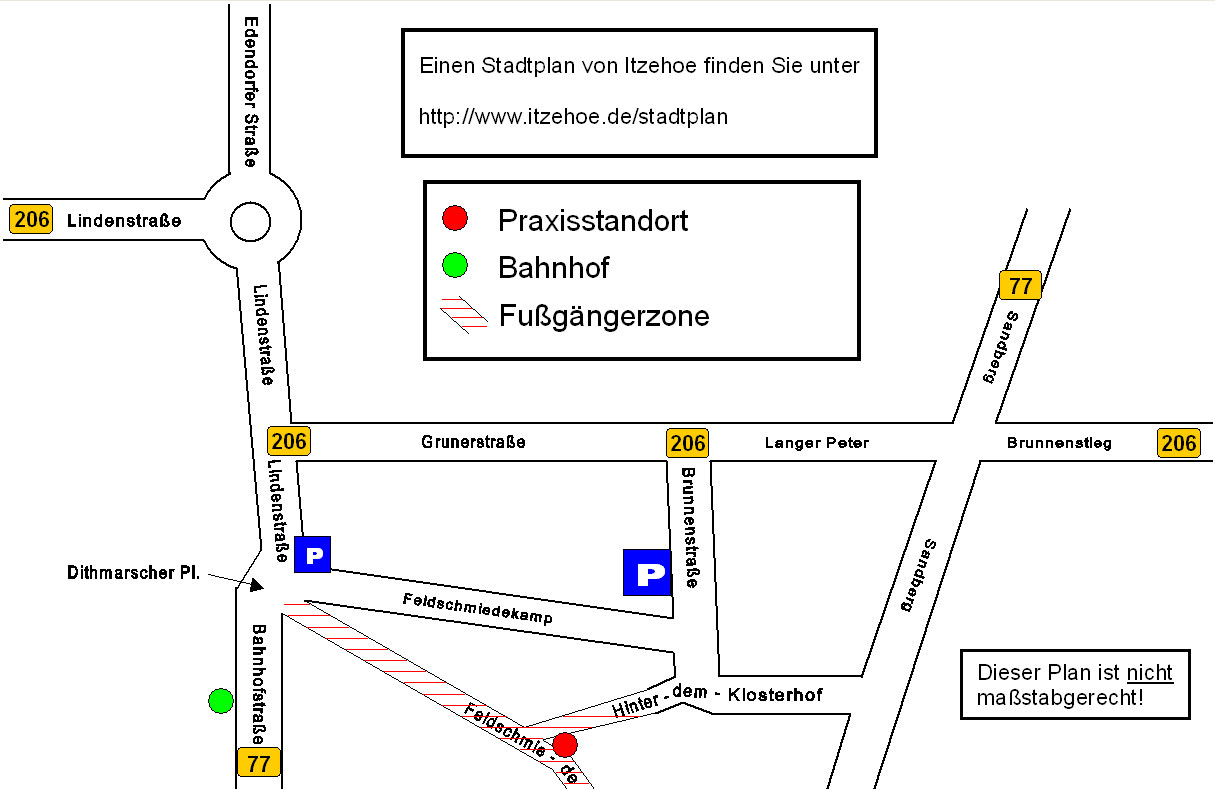 | Unsere Praxis liegt direkt am Holstein-Center in der Fußgängerzone (3. Etage, selbstverständlich eigene Toiletten, Fahrstuhl, rollstuhlgerecht). Der Bahnhof Itzehoe ist ca. 500 m, die nächstgelegene Bushaltestelle (Dithmarscher Platz) ca. 300 m entfernt. Mit dem Pkw erreichen Sie uns wie folgt: |